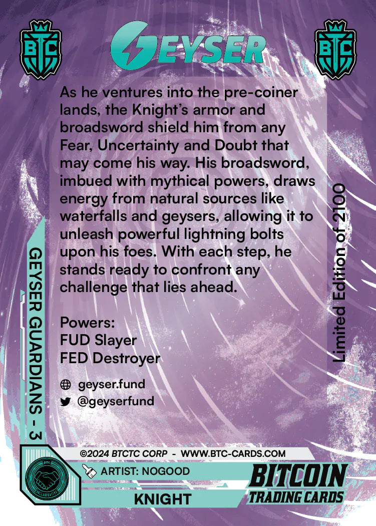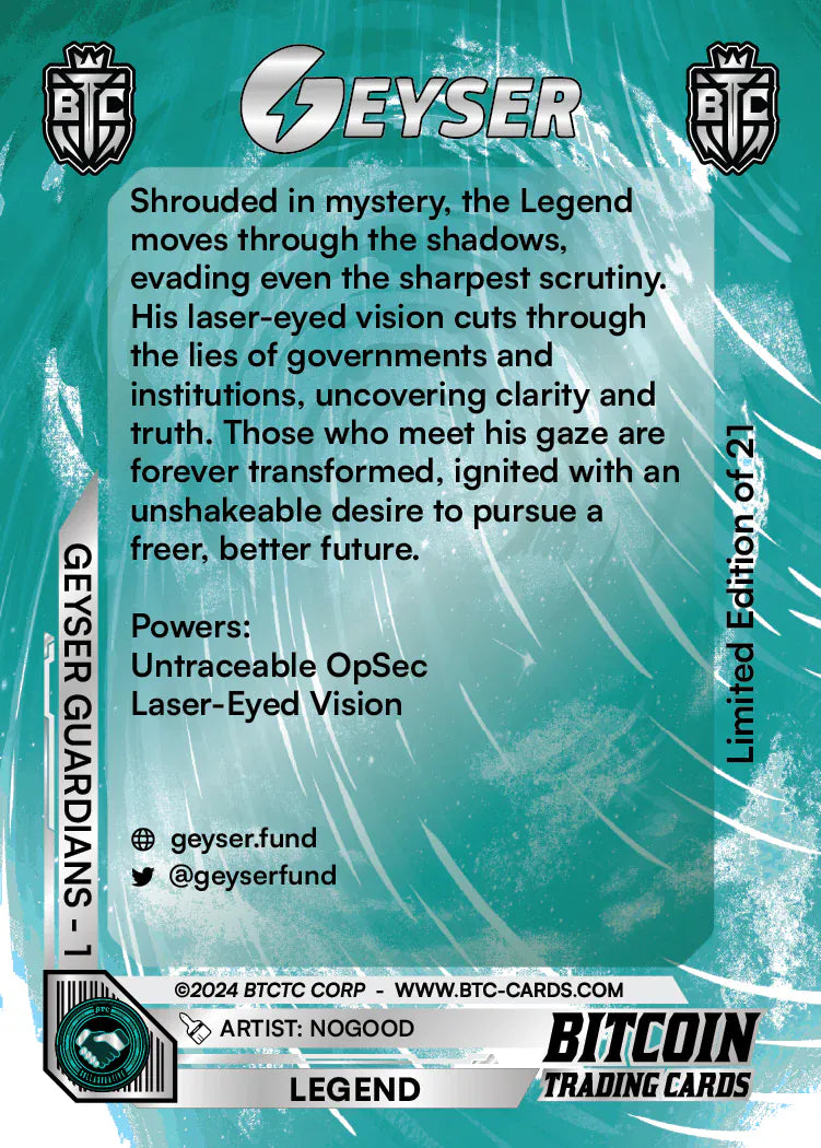 Geyser’s mission is to push Bitcoin adoption forward. Geyser Guardians are the defenders of this mission. Their bravery will be rewarded with rare artifacts.