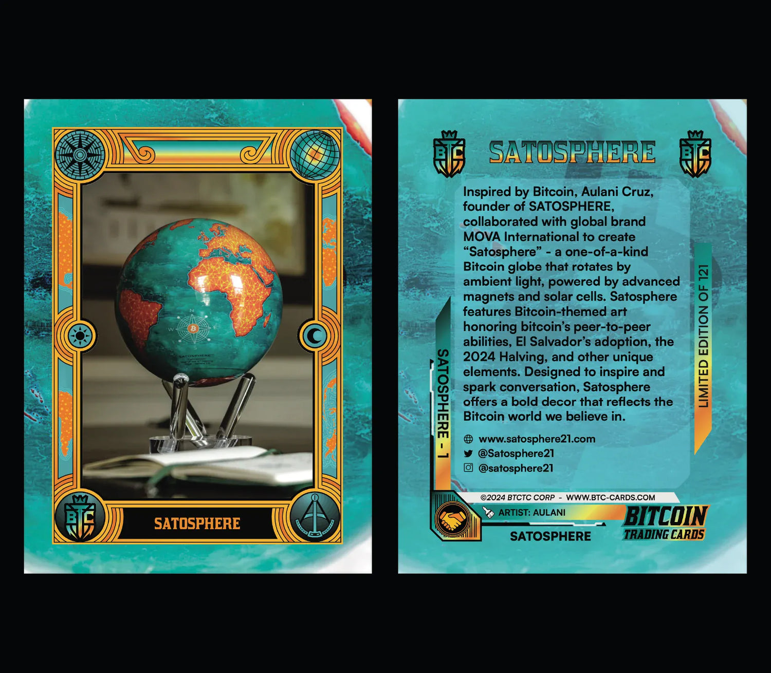 To celebrate the launch of the Satosphere globe, Bitcoin Trading Cards created an exclusive, limited edition of 121 Satosphere trading cards. A collector’s item for Bitcoiners who appreciate innovation, history, and decentralization.